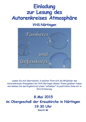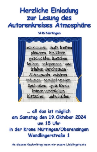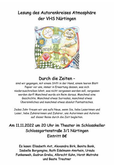 Ein jeder dieser Begriffe lässt sich übertragen auf die Gemeinschaft des Autorenkreises Atmosphäre der VHS Nürtingen und so stellen auch wir, die Autorinnen und Autoren, gerne unser diesjähriges